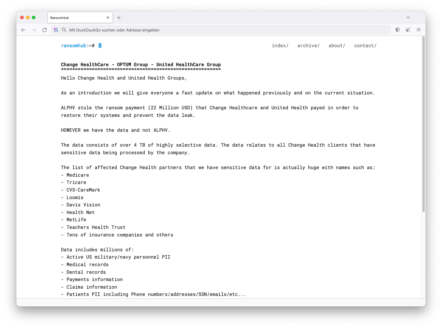 Jetzt verlieh der Erpresser auf der Darknet-Plattform RansomHub seiner Forderung erneut Nachdruck: Change Healthcare habe noch eine letzte Chance, die Daten zu schützen. Erreiche man keine Einigung, so werde er den vollen Datensatz von immerhin 4 TByte dem Höchstbietenden zum Verkauf anbieten. Die Daten enthalten nach Aussage des Kriminellen neben medizinischen Informationen auch Telefonnummern, Adressen und Sozialversicherungsnummern – wichtige Daten zum Identitätsklau.