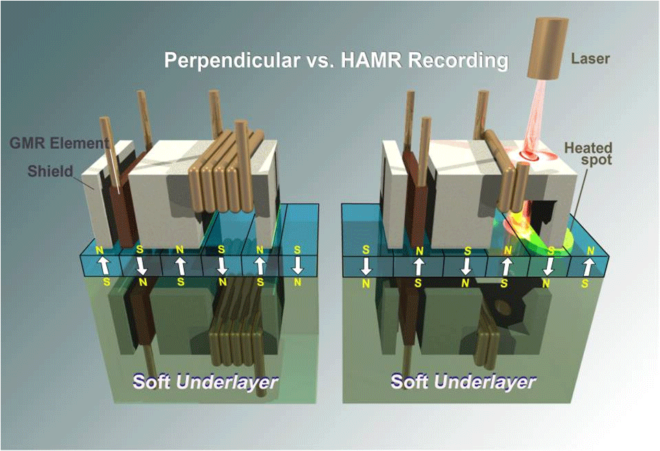 Das Heat-Assisted Recording – kurz HAMR – gilt schon länger als Schlüsseltechnik für noch größere Festplatten, denn es ermöglicht den Einsatz von Magnetmaterialien mit höherer Koerzitivkraft, bei denen der superparamagnetische Effekt weniger stark ausgeprägt ist – einer wichtigen Voraussetzung, um die magnetischen Domänen in der Magnetscheibe noch weiter aneinanderrücken zu können.