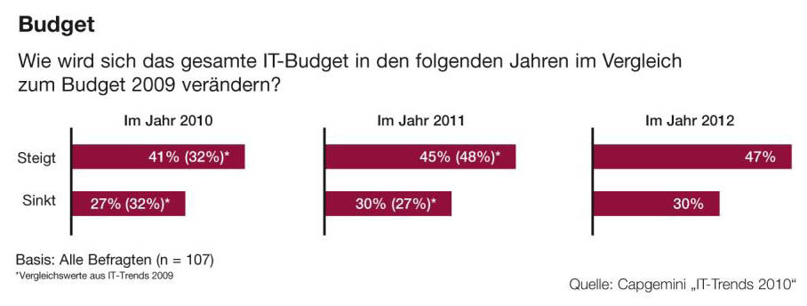 Im Rahmen der Studie "IT-Trends 2010" hatte Capgemini im November 2009 über 130 IT-Verantwortliche aus Großunternehmen im deutschsprachigen Raum befragt. Die jetzt veröffentlichten Vorabergebnisse deuten eine Trendwende an. Im vergangenen Jahr gaben noch weniger als ein Drittel der Befragten an, 2009 über ein höheres IT-Budget verfügen zu können – gut 40 Prozent mussten sich hingegen auf gekürzte Gelder einstellen. Aktuell sind nur noch 27 Prozent der IT-Abteilungen von niedrigeren Budgets bedroht. Rund 28 Prozent müssen mit den gleichen Mitteln wie in diesem Jahr auskommen.