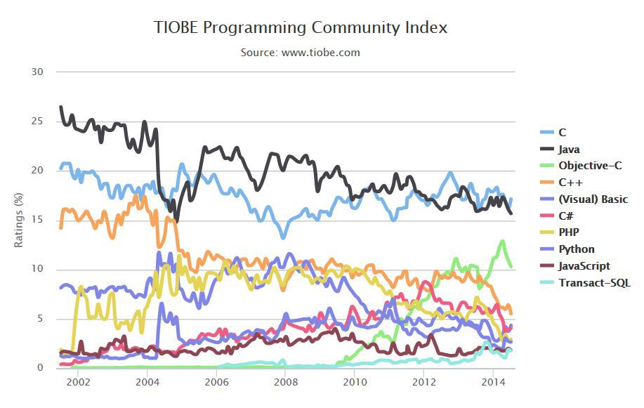 Objective-C liegt im Index derzeit mit 10,29 Prozent an dritter Position. Die weiteren Podestplätze nehmen C (17,15 %) und Java (15,69 %) ein. Ebenfalls in den Top 10 zu finden sind C++ (5,52 %), (Visual) Basic (4,34 %), C# (4,05 %), PHP (2,92 %), Python (2,66 %), JavaScript (1,81 %) und Transact SQL (1,76 %), das Anfang des Jahres zur Sprache des Jahres 2013 gekürt worden war.