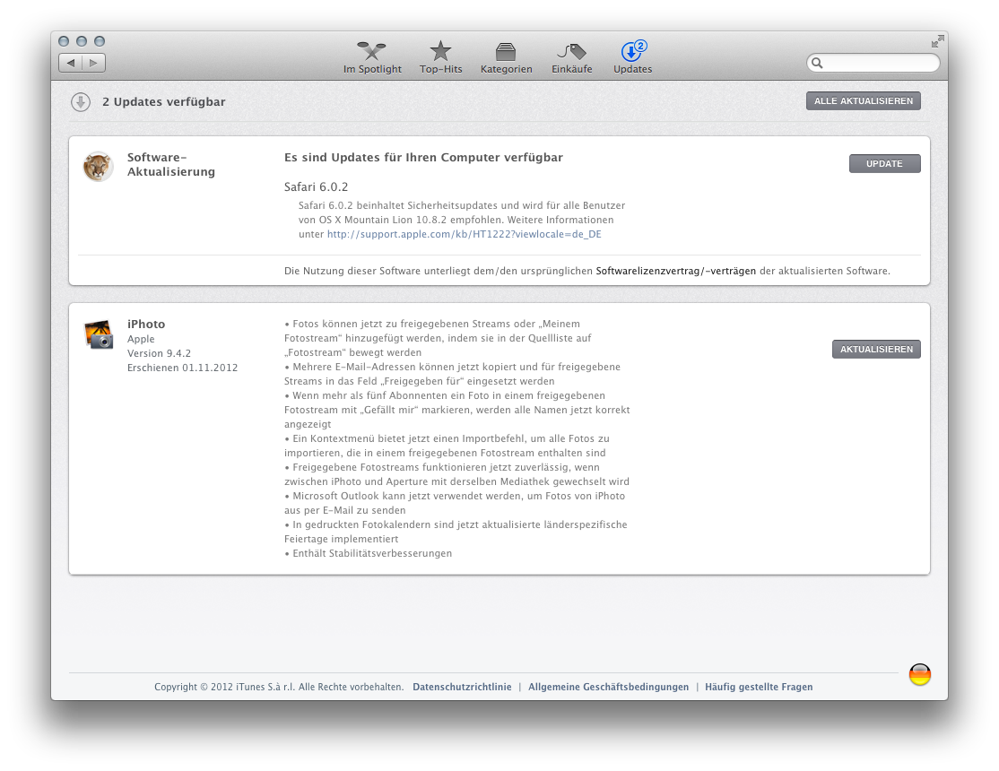 Neben iOS 6.0.1 hat Apple am Donnerstagabend für drei seiner Mac-Anwendungen Aktualisierungen veröffentlicht: Safari 6.0.2 ist ein reines Sicherheitsupdate, das zwei Schwachstellen in WebKit beseitigen soll – beide konnten nach Beschreibung des Unternehmens für das Ausführen von Schadcode bei Aufruf einer manipulierten Webseite genutzt werden. Das Browser-Update setzt OS X 10.7.5 oder 10.8.2 voraus und ist über die Softwareaktualisierung erhältlich.