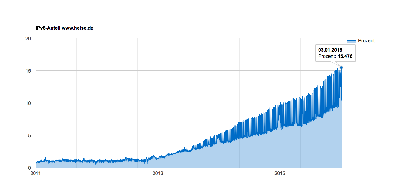 Dabei gibt es regional drastische Unterschiede. Laut Googles Statistik kommen aus den USA rund 25 Prozent der Google-Anfragen per IPv6 an. Andere Länder fallen dagegen teils deutlich ab oder tragen noch gar nicht bei zum IPv6-Verkehr. heise online registriert seit 2013 einen deutlichen und auch anhaltenden Anstieg des IPv6-Verkehrs. Er schwankt im Wochenverlauf und der aktuelle Spitzenwert liegt knapp über 15 Prozent.