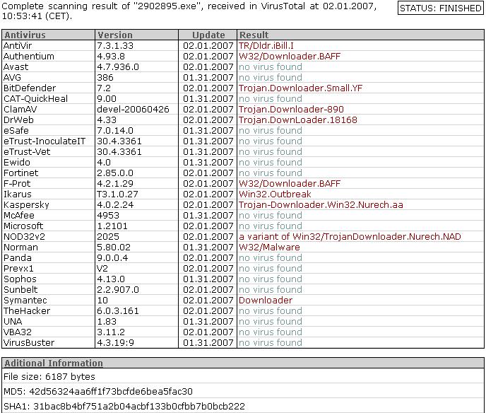 Mittlerweile erkennen fast alle Virenscanner den Schädling. Allerdings stehen für AVG, Avast, eSafe, Ewido, McAfee, Microsoft, QuickHeal, Rising, UNA und VBA32 immer noch keine offiziellen Signaturen bereit.