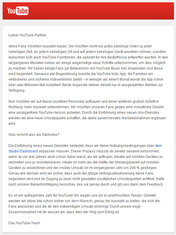Das Videoportal Youtube will seinen Nutzern schon bald gegen Bezahlung eine werbefreie Version im Abonnement anbieten. Das geht aus einer Nachricht an Inhalteanbieter hervor, aus der Techcrunch zitiert. Damit bestätigen sich auch Berichte, die bereits seit längerem auf diesen Schritt vorbereitet hatten.