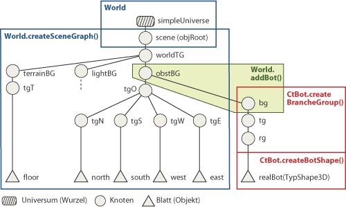 Intern sortiert Java3D die virtuelle Welt streng hierachisch als Baum, auf dessen Zweigen alle Elemente ihren Platz finden: sichtbare und unsichtbare Körper, Texturen und Lichtquellen, Blickpunkte, aber auch Verschiebungen oder Drehungen. Das gesamte Gebilde wird Szenegraph genannt; seine Wurzel bildet das künstliche Universum, seine Blätter die einzelnen sichtbaren Objekte der Simulationswelt wie Boden, Wände oder Bots. Dazwischen liegen Knoten, die für Transformationen sorgen oder das Verhalten und Aussehen von Objekten bestimmen.