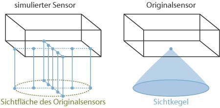 Würde man den beachtlichen Einfallswinkel der Abgrundsensoren von rund 80 Grad analog zu den IR-Entfernungsmessern über ein PickConeRay-Objekt modellieren, erhielte man immer nur die kürzeste Distanz zum nächsten Objekt - der Sensor würde (anders als sein reales Vorbild) eine Stufe erst melden, wenn sein gesamter Einfallskegel ins Nichts blickt.