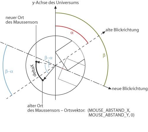Seitlich wandert der Maussensor in einem Kreis um den Mittelpunkt des Bot (siehe Abbildung oben); bei der Berechnung dieser Bewegungskomponente ist daher nur die Änderung der Orientierung von Belang. Die Hilfsmethode SimUtils.getRotation() verwandelt die alte und die neue Blickrichtung in Bogenmaße bezogen auf die Richtung der positiven y-Achse der Simulatorwelt. Deren Differenz, multipliziert mit der Distanz des Sensors vom Bot-Zentrum und wiederum von Metern in Punkte gewandelt, ergibt den gesuchten seitlichen Ausschlag (deltaX):