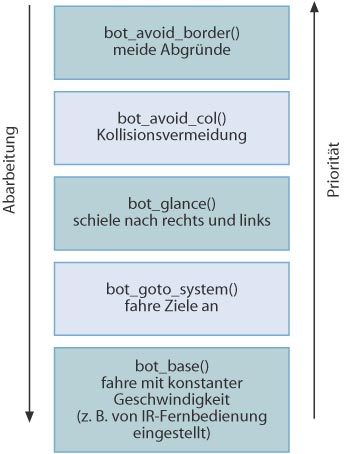 In regelmäßigen Abständen ruft das Hauptprogramm bot_behave() auf. Dieses arbeitet den Regel-Stapel ab und beginnt dabei mit dem Verhalten höchster Priorität. Dazu springt bot_behave() die Funktion an, auf die der Zeiger job->work verweist. Sobald eine Regel absolute Wünsche äußert (speedWishLeft oder speedWishRight), bricht bot_behave() die Verarbeitung ab und übermittelt die Geschwindigkeiten an die Motoren. Darunterliegende Regeln kommen nicht mehr zum Zug. So kann der Bot beispielsweise sofort stoppen, wenn er auf einen Abgrund zusteuert.