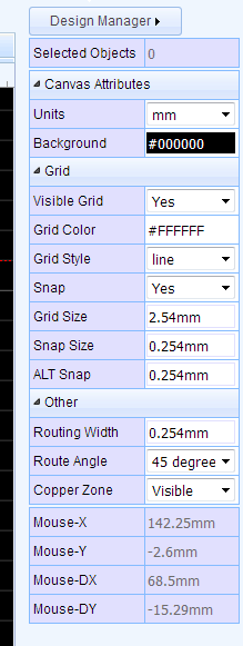 Das Lineal am Rand und auch die anderen Maße sind per Vorgabe auf die Einheit mil, was beim Design von PCBs üblich ist und 1/1000 Inch entspricht. Sie können die Einheit und die Rasterdarstellung ändern, indem Sie im rechten Bereich die Rubrik Canvas Attributes und Grid aufklappen. Vorher müssen Sie ggf. einmal auf die schwarze Hintergrundfläche klicken.