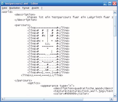 So fassen world-Tags die ganze Beschreibung ein und parcours-Tags die ASCII-Definition der Welt. Da sich jede Zeile zwischen line-Tags befindet, kann ein Standard-XML-Parser die Datei einlesen. Ob sie nun mit Windows- oder Unix-Zeilenumbrüchen arbeitet, spielt keine Rolle, der Zeichensatz (in diesem Beispiel UTF-8) ebenso wenig. Damit der Parser es einfach hat, eine effiziente Welt - die aus möglichst wenigen Elementen besteht - zu bauen, gibt es neben dem X für quadratische Wände noch die Zeichen = und #. Sie geben dem Parser die Richtung vor, in der er Wandelemente zusammenfassen darf.