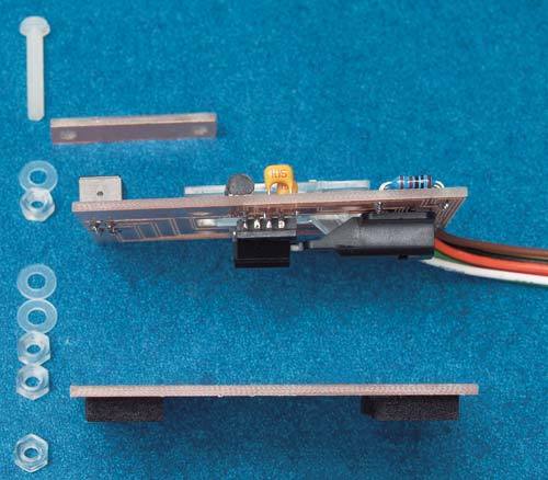 Der Sensor-Chip (U3) kommt - nachdem man die Schutzfolie entfernt hat - von der Leiterbahnseite auf die Platine. Das für die Detektion benötigte Licht liefert die Leuchtdiode (LED1) aus einem Kunststoffträger heraus. Dieser sitzt zusammen mit dem Chip auf einer Seite. Die Linsenplatte kommt auf die andere Seite. Die zwei kleinen Platinenstreifen fixieren sie. Je eine PVC-Mutter und eine Unterlegscheibe sorgen für den richtigen Abstand und verhindern zu hohen Druck auf die Kunststoffteile (siehe Foto S. 209).
