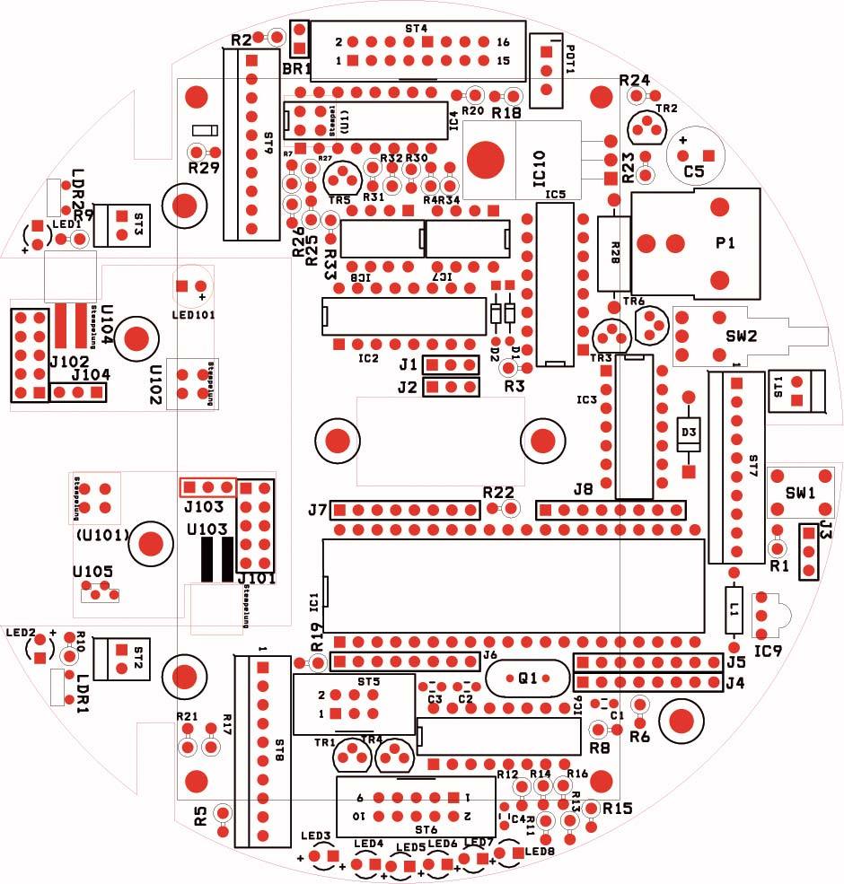 Der Reflexkoppler U1 auf der Hauptplatine soll später den Schwenkarm zur Verriegelung des Transportfachs detektieren und wird als einziges Bauteil von unten mit der Platine verlötet (Bauteilestempelung in Richtung U10). Alle anderen Bauteile kommen auf die Oberseite (Bestückungsdruck). Die Kabelbäume werden durch die Schlitze in der Platine nach unten geführt. Das vereinfacht die Montage.