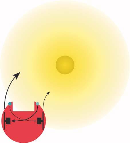 Sensoren erlauben es einem Roboter, seine Umgebung wahrzunehmen und unmittelbar auf Reize zu reagieren. So bewegten sich die Stammväter aller mobilen Roboter, die kybernetischen Schildkröten von W. Grey Walter aus den Jahren 1948/49, zielgerichtet auf Lichtquellen zu. Die Steuerung besorgte je ein Analogrechner aus zwei Röhren; seine Leistung reichte allerdings aus, dass die Ur-Roboter ihrem Hunger nach Licht folgen konnten [1]. Komplizierte Algorithmen fallen bei einer derartigen Reise ins Helle nicht an: Wollen c't-Bots das Verhalten ihrer Ahnen nachahmen, müssen sie lediglich ihre Lichtsensoren direkt an den jeweils gegenüber liegenden Motor koppeln (siehe Abbildung).
