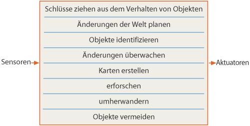 Die Subsumptions-Architektur verfolgt den eleganten Ansatz, komplexes Verhalten auf einem Fundament simpler Verhaltensbausteine zu konstruieren. Die einfachen Benimm-Blöcke (wie „Objekte vermeiden“) werden von abstrakteren Handlungsweisen (wie „erforschen“) eingefasst oder subsumiert - daher der Name des Modells (siehe Abbildung). Was auch immer auf der höheren Ebene geschieht, das Fundament seines Verhaltens, die Bausteine seines guten Benehmens, vergisst der Roboter dadurch nie. Sind die Grundregeln möglichst allgemein gehalten, reagiert er flexibel auf eine sich permanent verändernde Umwelt. Der Roboter handelt in jeder Situation gezielt, aber sicher: Ein plötzlich auftauchendes Hindernis gefährdet den vorwitzigen mechatronischen Forscher keineswegs, wenn die Steuerung fürs Auskundschaften den Reflex mit einschließt, potenziell gefährliche Objekte zu vermeiden.