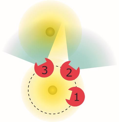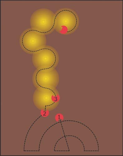 Bevor der Bot mit dem Sport beginnen kann, muss er den Slalomkurs in den Weiten der Welt allerdings erst einmal finden. Erspäht er überhaupt kein Licht, durchsucht er die Gegend nach einem einfachen Muster: Er fährt geradeaus bis zur nächsten Wand und beginnt das Gelände auf konzentrischen Halbkreisen mit wachsendem Radius zu durchkämmen (siehe Abbildung). Früher oder später sollte er auf diese Weise das Licht erblicken, das er ansteuert wie seine Urahnen, die kybernetischen Schildkröten. Identifiziert er mit seinen Distanzsensoren in erleuchteter Umgebung eine Säule, beginnt der Slalomkurs. Hierbei muss der Bot eigentlich die Stangen im Auge behalten, die links und rechts an ihm vorbeiziehen, seine Entfernungsmesser blicken aber strikt nach vorne und bieten nur einen eng begrenzten Blickwinkel. Der c't-Bot löst dieses Dilemma geschickt, indem er sich auf seinem Kurs regelmäßig umschaut und neu orientiert.