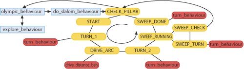 Ist der Roboter endlich nahe genug an ein Hindernis herangekommen und melden die Lichtsensoren ausreichende Helligkeit, geht der Bot davon aus, dass es sich um eine Slalomstange handelt. Er fährt dann um das Hindernis herum, bis das nächste auftaucht. Die Anzahl der notwendigen internen Zustände (siehe Abbildung unten) reduziert ein einfacher Kniff: Jeder Zustand ist auch für spiegelsymmetrische Situationen nutzbar. Verliert der Bot die aktuelle Slalomstange aus den Augen, wechselt er wieder in den Zustand, in dem er bot_olympic_behaviour() verlassen hat: