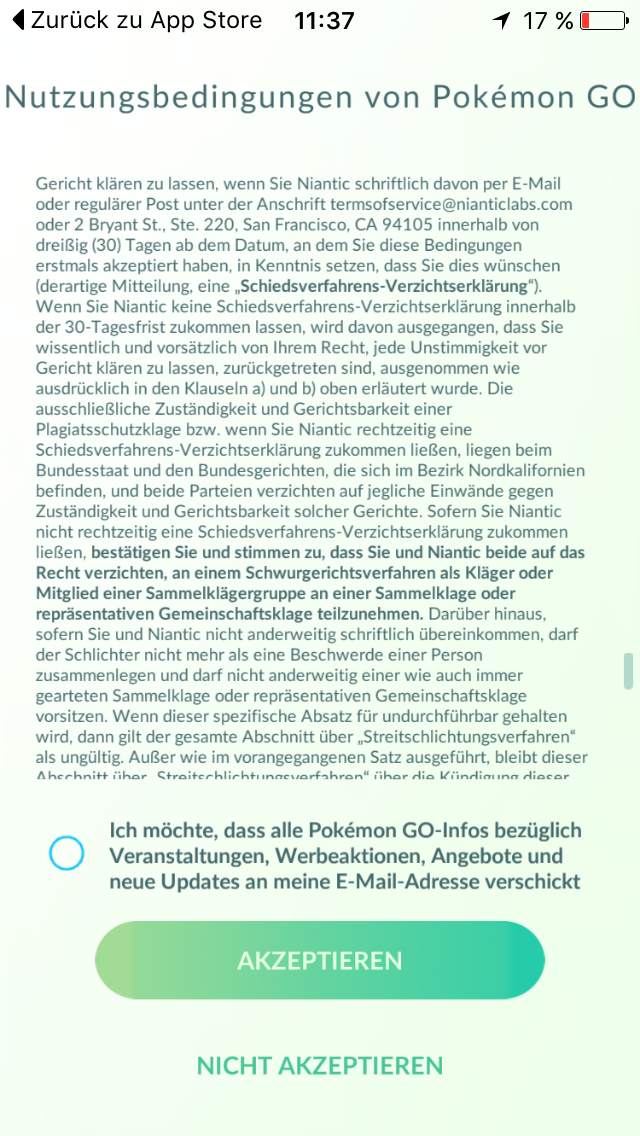 Überraschend für Verbraucher (und Juristen) ist auch die "Schiedsgerichts-Verzichtsklausel": "Wenn Sie Niantic keine Schiedsverfahrens-Verzichtserklärung innerhalb der 30-Tagesfrist zukommen lassen, wird davon ausgegangen, dass Sie wissentlich und vorsätzlich von Ihrem Recht, jede Unstimmigkeit vor Gericht klären zu lassen, zurückgetreten sind [...]". Diese Klauseln dürfte für deutsche Verbraucher nicht gelten, da sich das Spiel (auch) an deutsche Spieler richtet, was sich schon daraus ergibt, dass alle Texte auch auf Deutsch verfügbar sind und auch die Sprache im Spiel für hiesige Spieler Deutsch ist. Man könnte sogar die Meinung vertreten, dass für einen Spieler nicht offensichtlich ist, dass es sich um einen amerikanischen Anbieter handelt. Dann wäre schon die Rechtswahl (Kalifornisches Recht) nach deutschem AGB-Recht im BGB unwirksam.