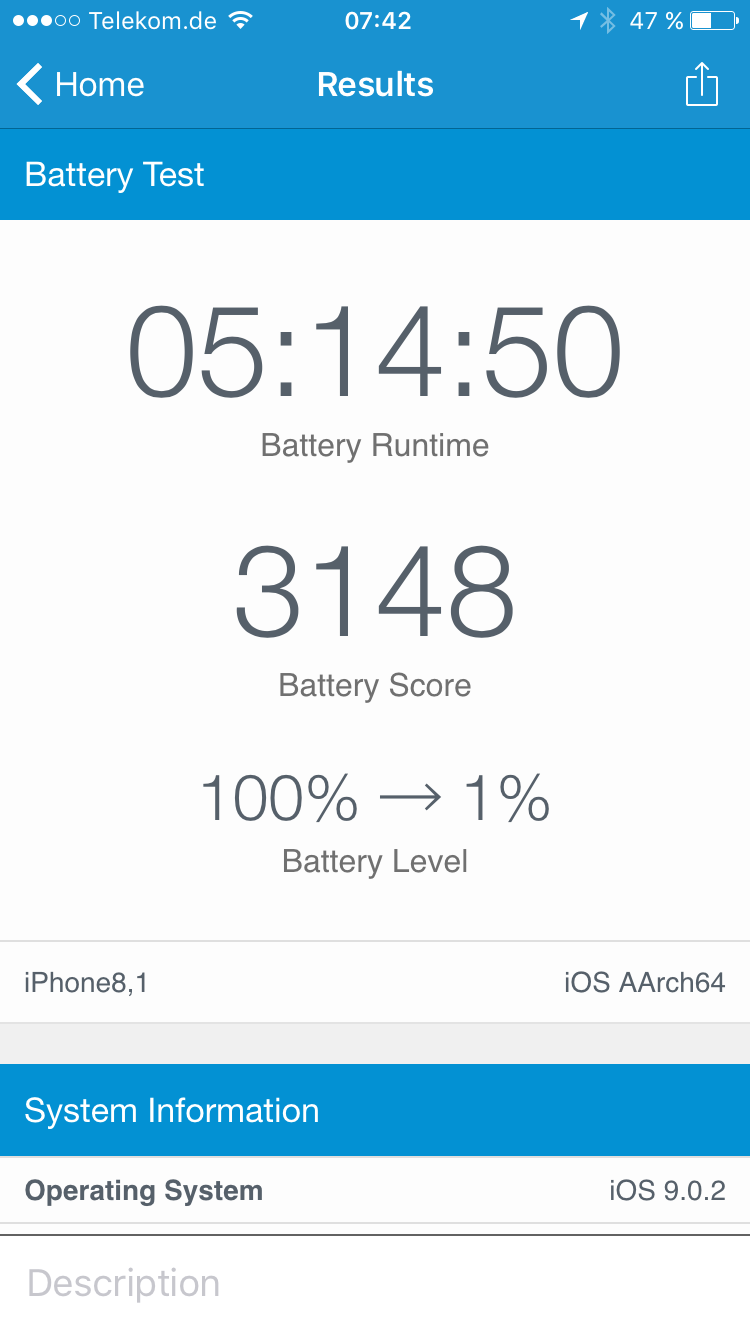 Schließlich luden wir noch zwei Apps aus dem App Store herunter, darunter ein weiteres Spiel, das wir eine Viertelstunde lang auf beiden Geräten synchron ausprobierten. Wir scrollten durch unsere Facebook-Timeline und bewegten uns durch die 3D-Ansicht von Berlin in Apples Karten-App. Die Gesamtnutzung betrug 4 Stunden und 46 Minuten. Danach zeigte das iPhone 6s mit TSMC-A9 noch 38 Prozent Akkukapazität an, das mit Samsung-A9 40 Prozent. Der von Apple angegebene Unterschied von 2 oder 3 Prozent ist also realistisch; wobei das Gerät mit TSMC-Chip anders als in dem Geekbench-Ergebnis sogar weniger Akkukapazität übrig hatte. Nicht auszuschließen, dass die Ergebnisse bei einem anderen Testszenario umgekehrt ausfallen. Die Unterschiede dürften sich aber auf einem ähnlichen Niveau bewegen.