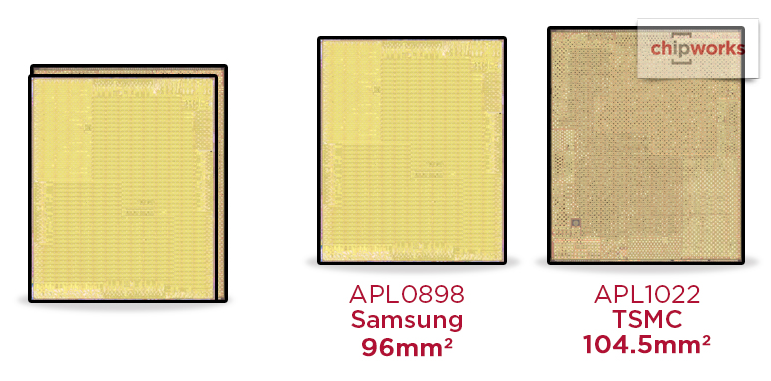 Laut einer Analyse von Chipworks ist der Samsung-Chip kleiner als der von TSMC. Man vermutet, dass TSMC die feinsten Transistoren des A9 mit einer Strukturbreite von 16 Nanometern fertigt, Samsung hingegen mit 14 nm. Diese Unterschiede lassen aber keine direkten RĂĽckschlĂĽsse auf den Energiebedarf und die Performance zu.
