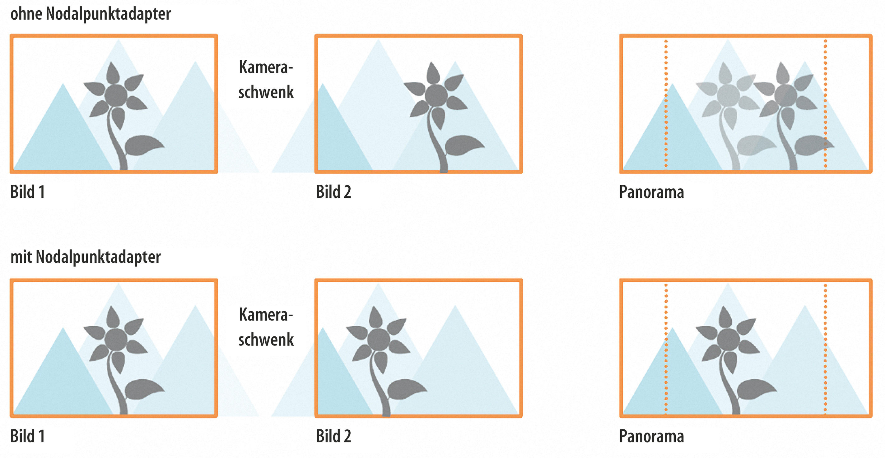 Wenn die Kamera bei der Aufnahme nicht um den Nodalpunkt geschwenkt wird, entsteht ein Parallaxenfehler. Bilder: Die Neue Fotoschule. Verlag dpunkt, Heidelberg, 2017