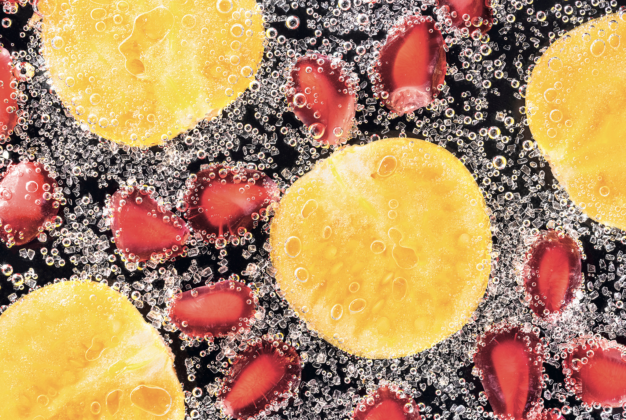 Wir zeigen Schritt für Schritt, wie Sie spannende Aufnahmen mit sprudelndem Wasser gestalten. Die darin gelöste Kohlensäure geht an den Oberflächen von Früchten und Gemüsen attraktiv in ihren gasförmigen Zustand über. Es bilden sich lauter hübsche, runde Gasbläschen. Mit unserem Zuckertrick vervielfältigen Sie diese sogar noch. Unser Workshop schont auch Ihr Gewissen. Nach dem Shooting können Sie die verwendeten Früchte einfach aufessen. Sie schwimmen nur kurz mit etwas Zucker im Wasser.