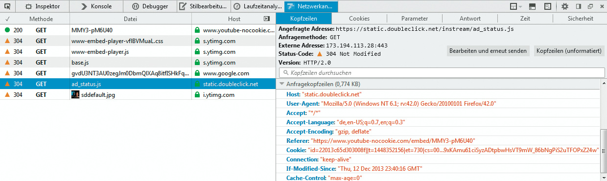 Die Firefox-Erweiterung „TamperData“ kann Header und POST-Parameter von Webseiten anzeigen und verändern, außerdem HTTP-Anfragen und -Reaktionen verfolgen. Ein Blick damit auf die Seite mit dem Video bestätigt den Verdacht: Schon deren bloßer Aufruf führt dazu, dass unter anderem eine Verbindung zu https://static.doubleclick.net aufgebaut und die Javascript-Datei „ad_status.js“ nachgeladen wird.