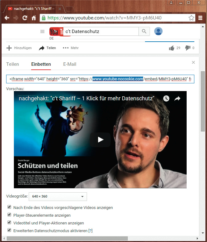 YouTube beschreibt dessen Arbeitsweise so: „Wenn du diese Option aktivierst, werden von YouTube keine Informationen über die Besucher auf deiner Website gespeichert, es sei denn, sie sehen sich das Video an“ [3]. Wenn das dazugehörige Auswahlkästchen aktiviert ist, ändert sich der im Einbettungscode vorgesehene Link: Aus „www.youtube.com“ wird „www.youtube-nocookie.com“.