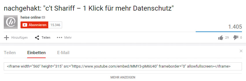 Als pragmatische Lösung bietet sich eine Option an, die YouTube seit Jahren bei der Erzeugung des Einbettungscodes anbietet, aber ausgesprochen gut versteckt: Man nimmt die Einbettung der Videos im „erweiterten Datenschutzmodus“ vor. Um diesen Modus zu aktivieren, ruft man zunächst die YouTube-Seite auf, auf der sich das eigentliche Video befindet. Nach der Wahl von „Teilen“, „Einbetten“ und „Mehr anzeigen“ erscheint schließlich die Option „Erweiterten Datenschutzmodus aktivieren“.