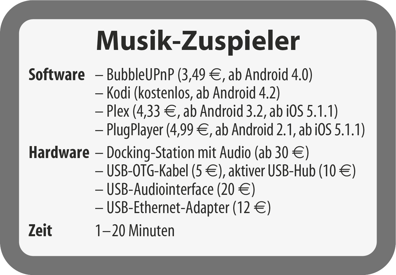 Am einfachsten geht es so: Tablet ans Netzteil und über die Kopfhörerbuchse an die Anlage anschließen, schon kanns losgehen.