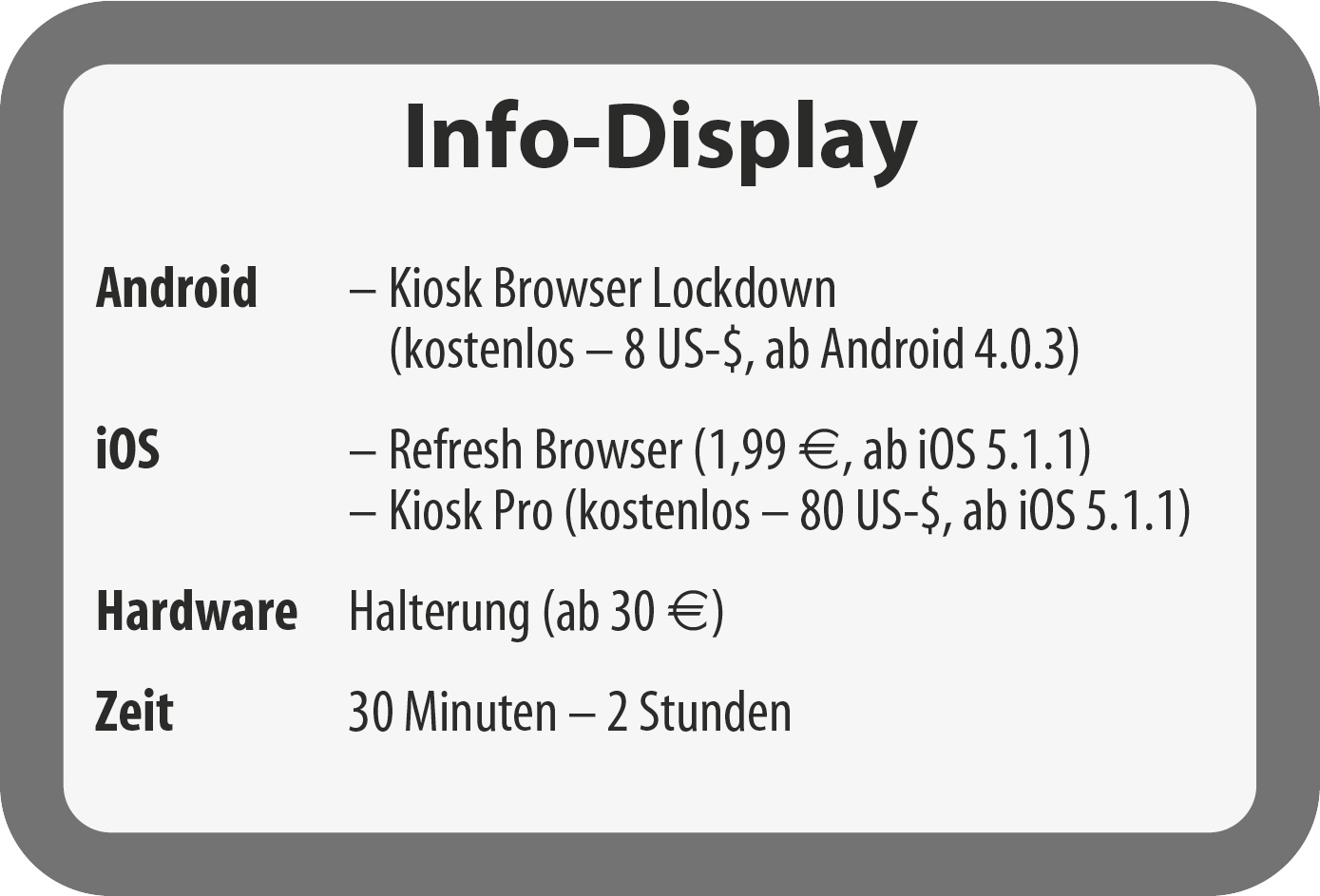 Soll das Tablet nur eine einzige bestimmte Seite anzeigen, so reicht es, das Gerät in eine Glasvitrine oder hinter das Schaufenster zu hängen. So kann man sicherstellen, dass niemand auf der Oberfläche herumwischt oder -tippt und zum Beispiel eine andere App öffnet.
