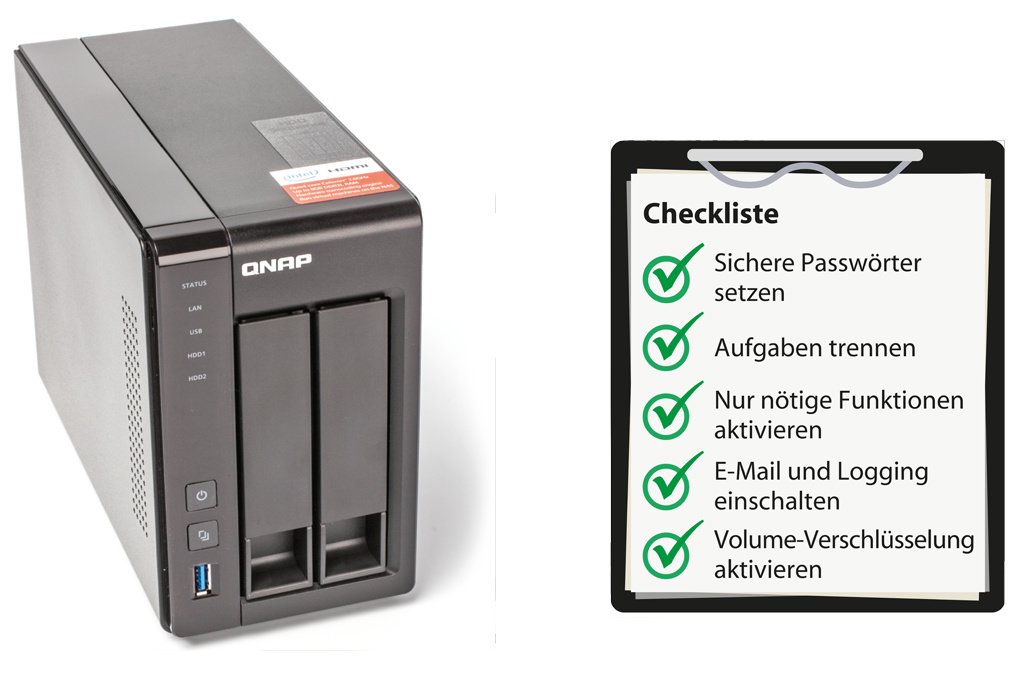 Beim Einrichten eines fabrikfrischen NAS (Network Attached Storage) führt ein Assistent im Browser durch die wichtigsten Schritte. Danach ist der Netzwerkspeicher zwar schon benutzbar. Aber manche Helfer vergessen wichtige Dinge, beispielsweise das Setzen eines Konfigurationspassworts oder das Ändern des vorgegebenen Passworts für „admin“ oder „root“. Stellen Sie für den Superuser ein sicheres Passwort ein, das sich von dem aller später eingerichteten Nutzer unterscheiden muss, und notieren Sie es an einer sicheren Stelle.