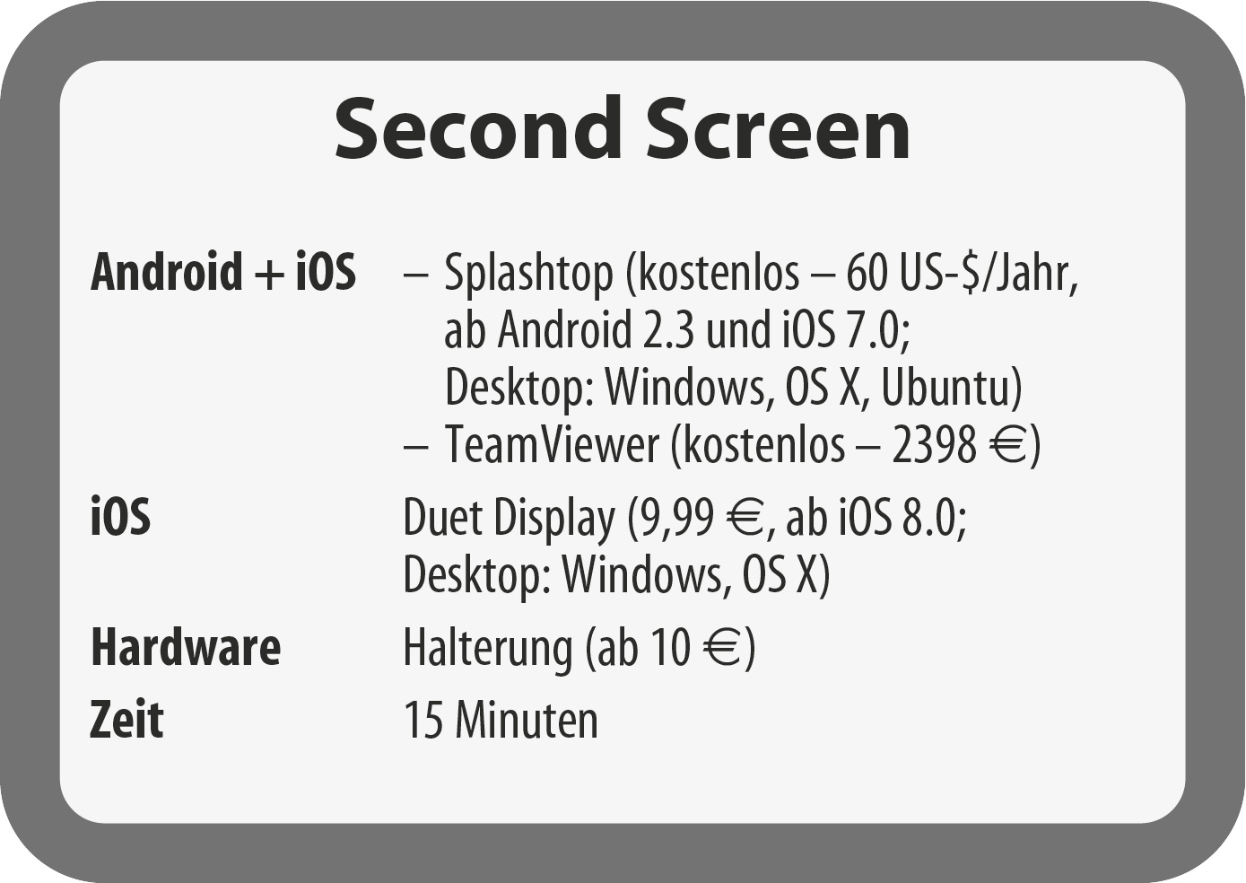 Unter den Lösungen, die den PC-Desktop auf das Tablet erweitern, haben wir mit Splashtop die besten Erfahrungen gemacht. Splashtop kann Tablets sowohl mit Android als auch iOS zum Zweitmonitor machen. Auf PC-Seite arbeitet dabei Windows, OS X oder Ubuntu. Splashtop streamt die Inhalte des Desktops in Echtzeit aufs Tablet. Die App selbst ist unter Android kostenlos, unter iOS kostet sie 2,99 Euro. Weitere Kosten fallen bei privater Nutzung im selben Netzwerk nicht an.
