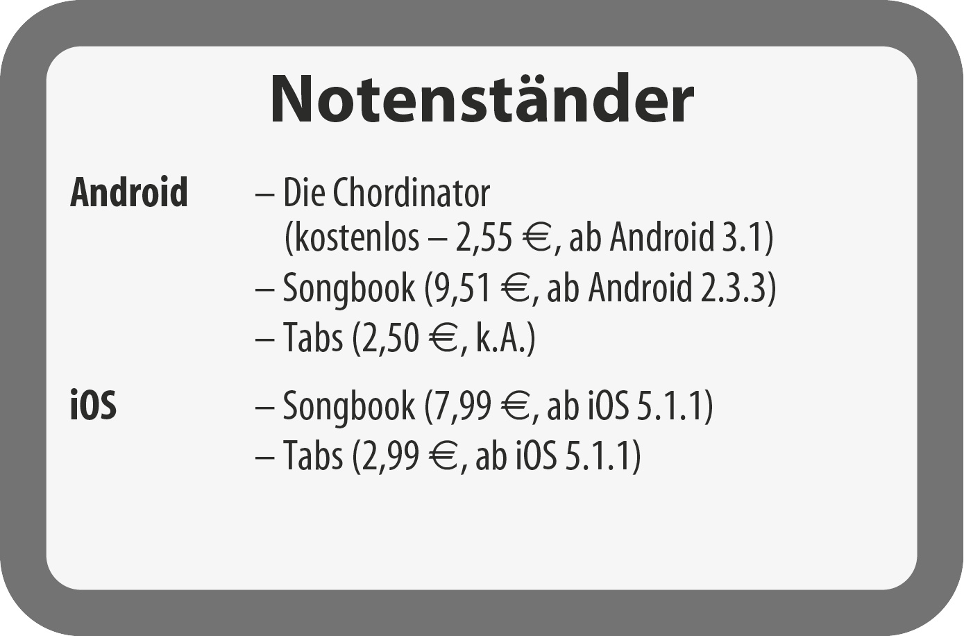 Früher brauchte man kiloweise Papier, um bei der Jam-Session für alle Eventualitäten gewappnet zu sein. Heute reicht ein Tablet. Sogar auf einem fünf Jahre alten Gerät ist ausreichend Platz für alle Songs von Abba bis Zappa.