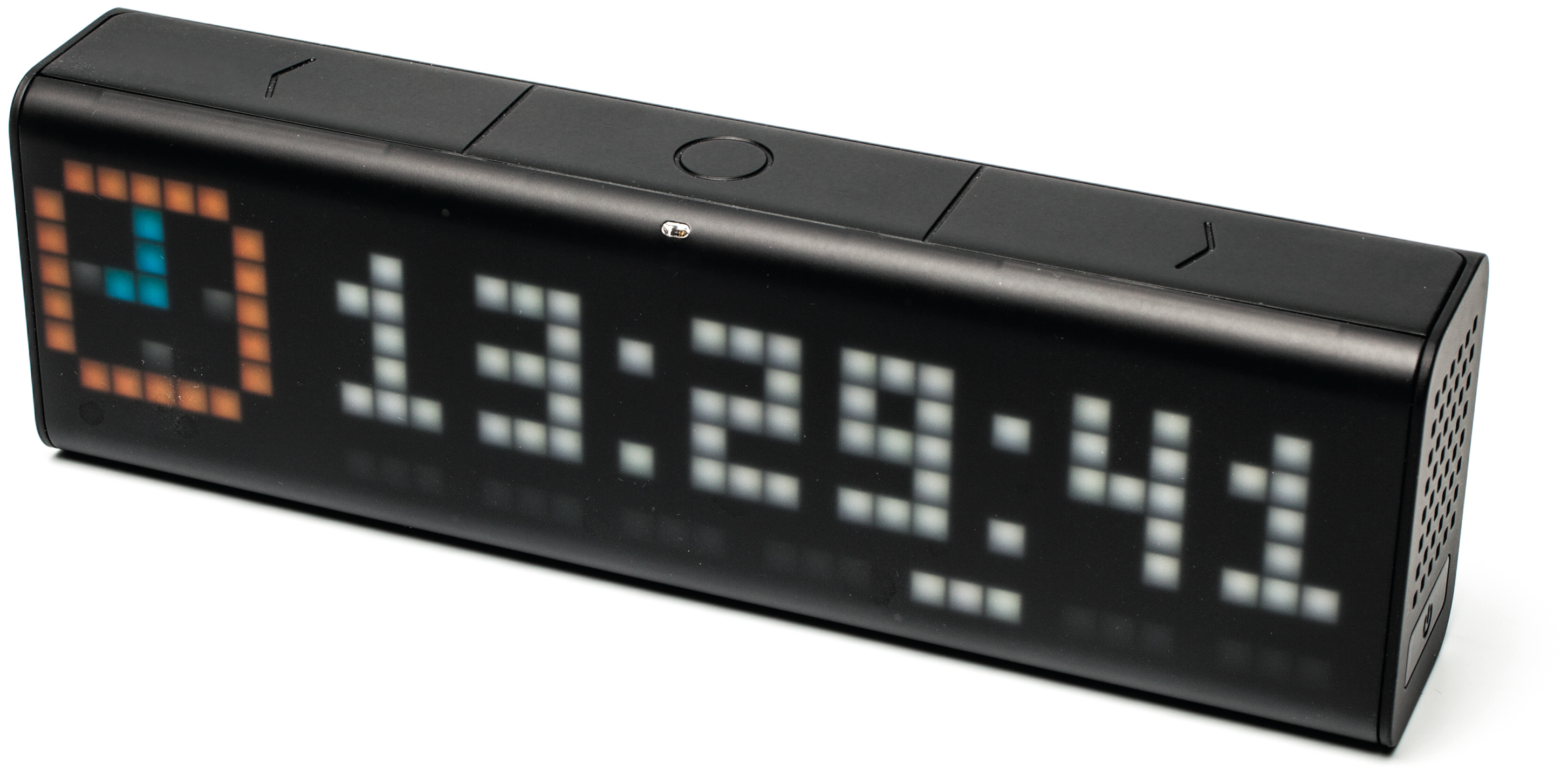 Selbst der Hersteller Smartatoms weiß nicht so recht, wie er die Produktgattung nennen soll, zu der LaMetric gehört. Am besten passt wohl „Smart Ticker“ – auch wenn das Gerät ebenso Datum oder Uhrzeit anzeigt und Musik-Streams aus dem Internet (via WLAN) und vom Mobilgerät (via Bluetooth) hörbar macht. Für letztere Aufgabe gibt es einen eingebauten Stereo-Lautsprecher und einen Kopfhörerausgang sowie zwei Tasten zur Lautstärkeregelung.