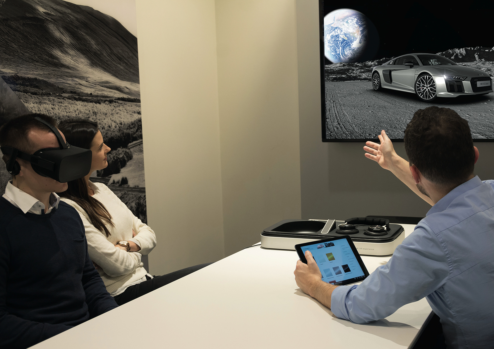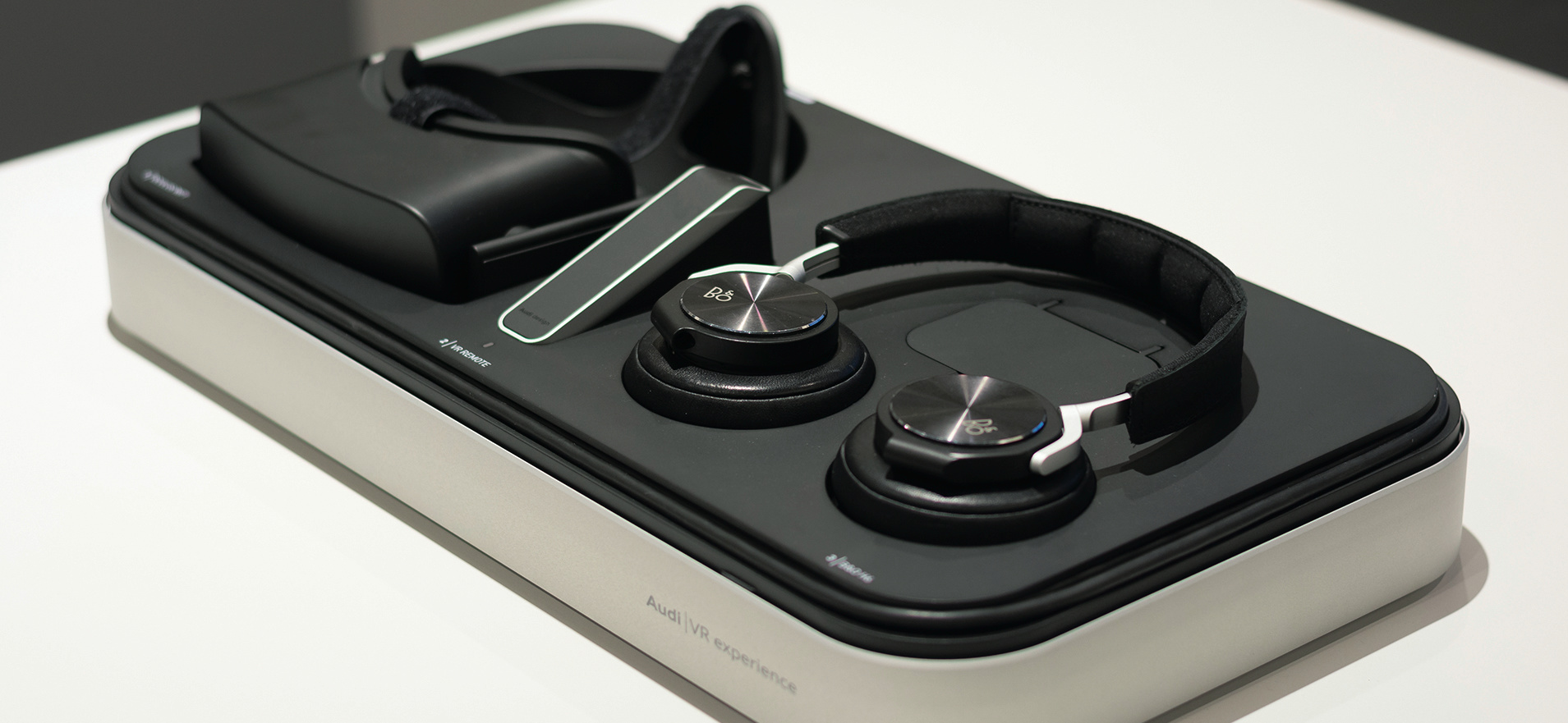 Da man Autos aber nicht nur angucken, sondern auch anhören kann, hat sich Audi auch bei der auditiven Komponente viel Mühe gegeben. So wurden alle erhältlichen Soundsysteme mit binauraler Kunstkopf-Technik aufgenommen. Die VR-Anwendung gibt sie mit 3D-Sound über Kopfhörer wieder; der Ton ändert sich entsprechend zur Kopfhaltung. Das dabei zu hörende Test-Musikstück hat Chris Hülsbeck produziert – Retro-Spielefans kennen seine Arbeit aus Titeln wie The Great Giana Sisters oder Turrican. In Sachen Hardware setzt Audi wie bei der Software auf Eigenentwicklungen: Der VR-Controller für den Kunden wurde komplett vom Autohersteller entwickelt, ebenso die Kopfhörer. Sie basieren auf dem Modell H6 von Bang & Olufsen, tragen aber zusätzlich Mikrofone an den Ohrmuscheln – damit der Kunde den Verkäufer auch mit Kopfhörern auf den Ohren deutlich versteht.