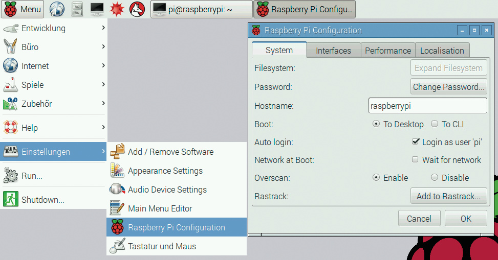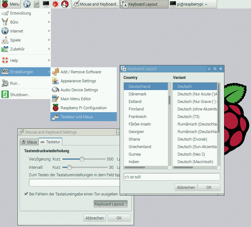 Zum Ändern von Systemeinstellungen steht raspi-config bereit. Beim Tastatur-Layout hat das Tool im Test allerdings versagt: Die Einstellung für die deutsche Tastatur ging bei jedem Neustart wieder verloren. Die Einstellungen des grafischen Desktops zeigten sich weniger vergesslich: Dort lässt sich ebenso bequem auf die deutsche Tastatur umschalten – und es hält.