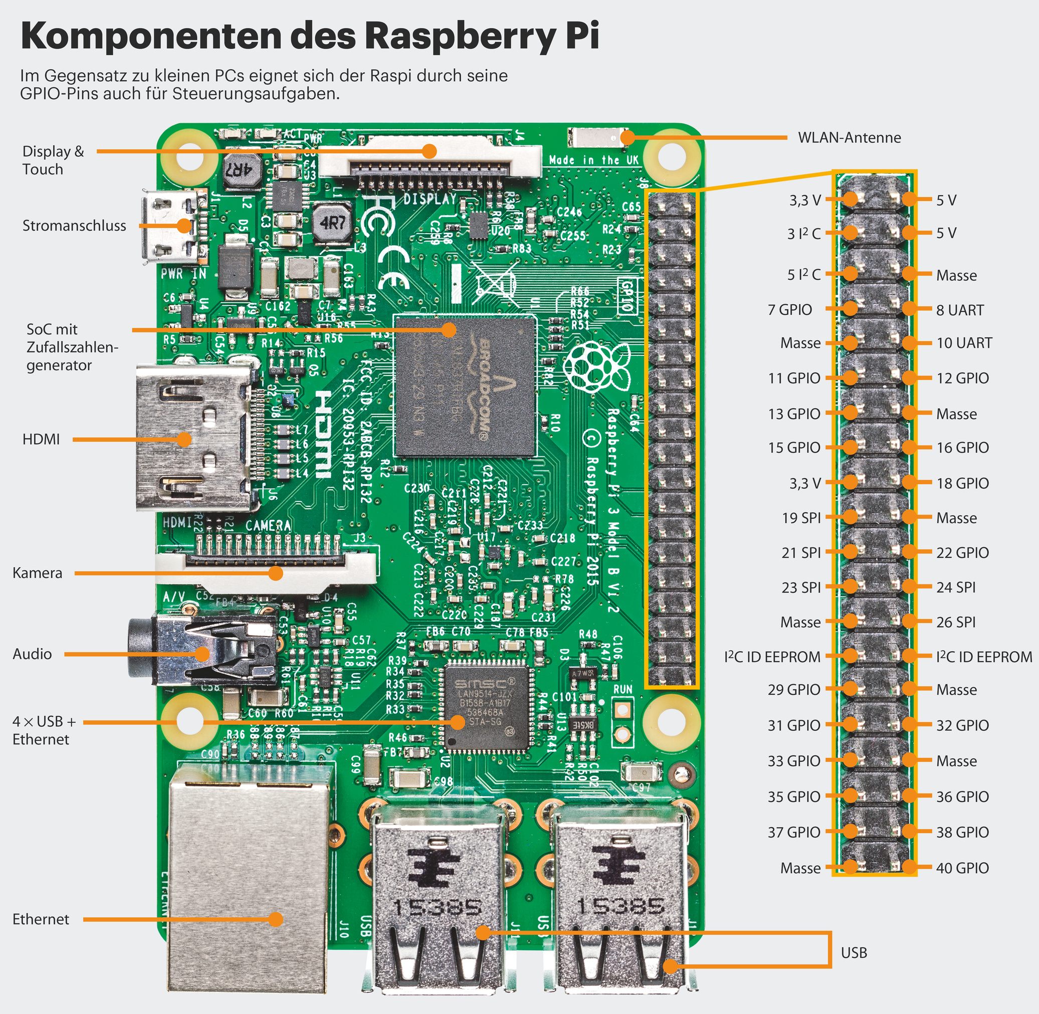 Klein, billig, sparsam, einfach: Der Raspberry Pi ist ein kompletter Computer mit den Seitenmaßen einer Kreditkarte, der nicht mal 40 Euro kostet. Die aktuelle Version 3 bietet sowohl eine Ethernet-Schnittstelle als auch integriertes WLAN, wodurch er sich zur Netzwerkanalyse eignet (siehe Seite 88). Sein System on a Chip (SoC) enthält neben vier ARMv8-Kernen (1,2 GHz) auch einen Hardware-Videodecoder [1]. Damit eignet er sich als Medienspieler mit dem Player-Frontend Kodi (siehe Seite 94). Mit seinem Hardware-Zufallszahlengenerator verteilt er sicheren Zufall im Heimnetz (siehe S. 108). Über ein passendes Display (Display- und Touch-Controller sind integriert) kann er einen täglich wechselnden WLAN-Schlüssel anzeigen (siehe S. 98). Ein Audioausgang mit 3,5-mm-Klinkenbuchse ist genauso an Bord wie ein Anschluss für eine HD-Kamera. Trotzdem verbraucht er im Leerlauf nur 2 und unter Last weniger als 5 Watt. Das macht ihn zum sparsamen Heimserver, beispielsweise für die Fotosammlung (siehe S. 104).