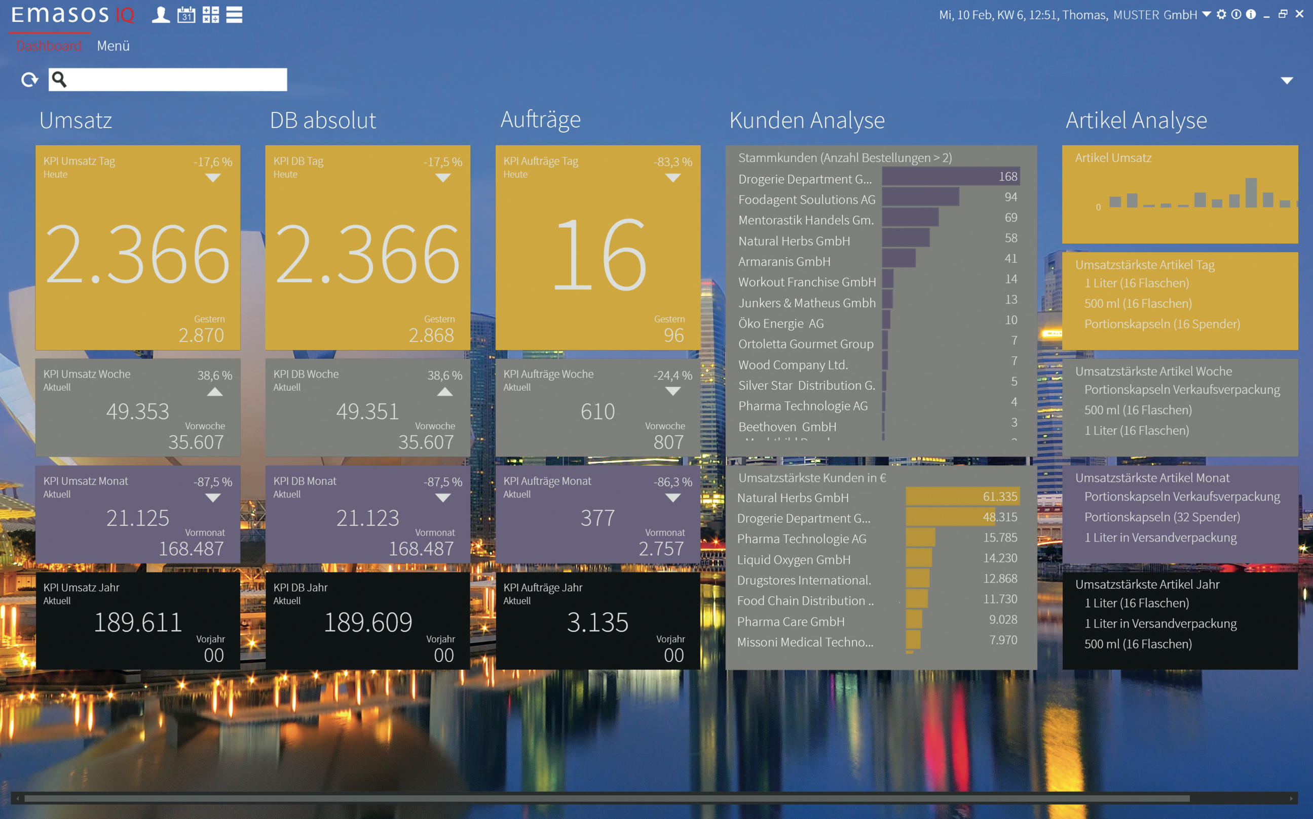 Die Programmfamilie Emasos IQ läuft auf einem Server im Unternehmen oder bei einem Hoster. Sie besteht aus – auch einzeln erhältlichen – Modulen für ERP, Finanzverwaltung, Produktionsplanung, CRM, Business Intelligence, Dokumenten- sowie Workflow-Management. Anwender verbinden sich damit über native Client-Apps mit responsive Display unter Windows, OS X, iOS oder Android. Diese Clients setzen in der neu erschienenen Release 2 voll Kacheln: Sie dienen gleichermaßen als Bedienelemente sowie zur Anzeige von Kennzahlen, anstehenden Aufgaben oder dem Fortschritt laufender Vorgänge. Außerdem lassen sich tabellarische Anzeigen so ähnlich bearbeiten wie in Excel – mit Werkzeugen zum Verschieben, Ein- und Ausblenden von Zeilen und Spalten bis zum Anlegen von Pivottabellen. Darüber hinaus kann man neue Abläufe und weitere Server-Erweiterungen in C# und der Skriptsprache LUA programmieren.