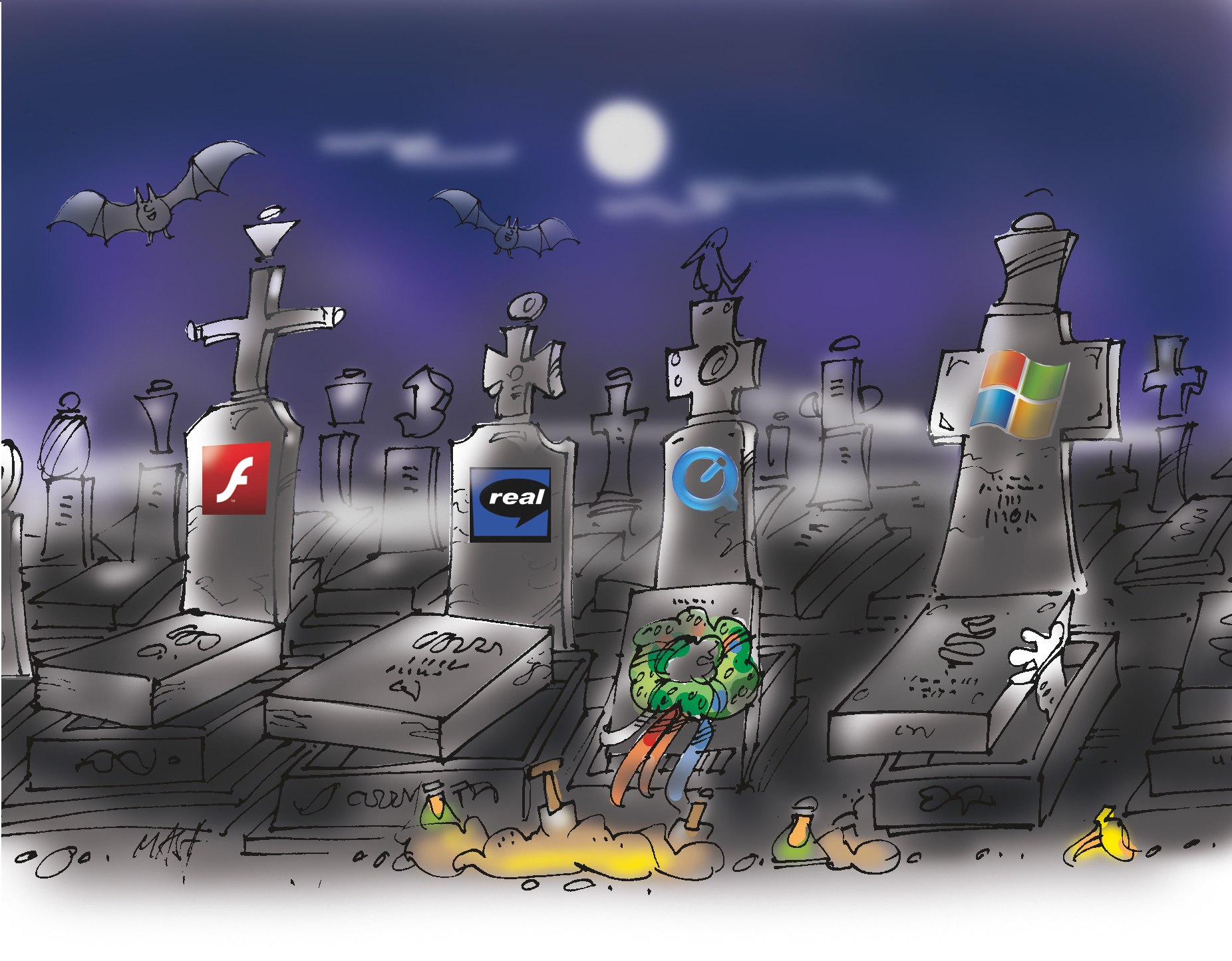 Der jüngste Todesfall hat sich im Hause Apple ereignet: Quicktime für Windows ist offiziell dahingeschieden. Der Apple-Player war gewissermaßen der Vorreiter der heutigen In-App-Käufe: Er funktionierte zwar, wer aber auf die abwegige Idee kam, damit ein Video im Vollbild abspielen zu wollen, sollte über Jahre hinweg die Pro-Version kaufen. Werden Sie Quicktime vermissen? Ich nicht. Falls Sie es noch auf dem Rechner haben, sollten Sie es umgehend deinstallieren. Es enthält üble Schwachstellen, die nicht mehr geschlossen werden (siehe Seite 40).