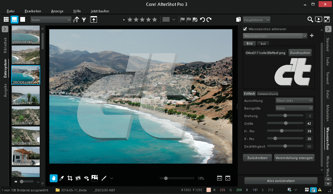 Der Raw-Entwickler Corel AfterShot Pro 3 verarbeitet Kamerarohdaten laut Hersteller deutlich schneller als Adobe Lightroom. Ausgebrannte Spitzlichter sollen sich besser restaurieren lassen als in der Vorversion. Beim Export fügt das Programm auf Wunsch Text oder ein Bild als Wasserzeichen ein. Dabei lassen sich Größe, Ausrichtung, Position und Transparenz anpassen. Die Schönheitsfehler-Korrektur retuschiert Hautfehler, Staub oder Flecken mit Pinsel und Auswahlwerkzeugen. Außerdem bietet AfterShot eine Reihe Plug-ins von Drittanbietern, bindet aber kein Photoshop-Plug-in ein.