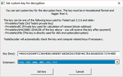 Mithilfe des kostenlosen Tools TeslaDecoder (siehe c’t-Link) kann man solche verschlüsselten Daten mit wenigen Klicks entschlüsseln. Der Entwickler des Werkzeugs, ein Sicherheitsforscher mit dem Pseudonym BloodDolly, hat den Master-Schlüssel dort bereits eingebaut. Bisher konnte TeslaDecoder nur Opfern von TeslaCrypt 2 helfen. Dank des Master-Schlüssels kann nun selbst die aktuelle Version TeslaCrypt 4.0 entschlüsselt werden, so der Macher des Tools.