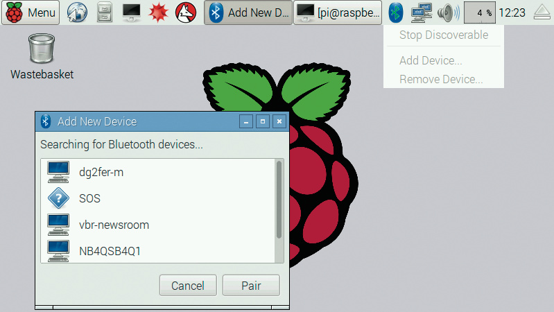 Die neueste Version des Raspberry-Pi-Betriebssystems Raspbian verbessert die Unterstützung für die Bluetooth-Hardware des Raspi 3. Dadurch muss man jetzt nicht mehr Kommandozeilenprogramme bemühen, um Bluetooth-Geräte zu suchen oder anzubinden, sondern kann das über Desktop-Anwendungen erledigen. Diese beherrschen aber vorerst nur Eingabegeräte und Hardware zur Audio-Ausgabe.