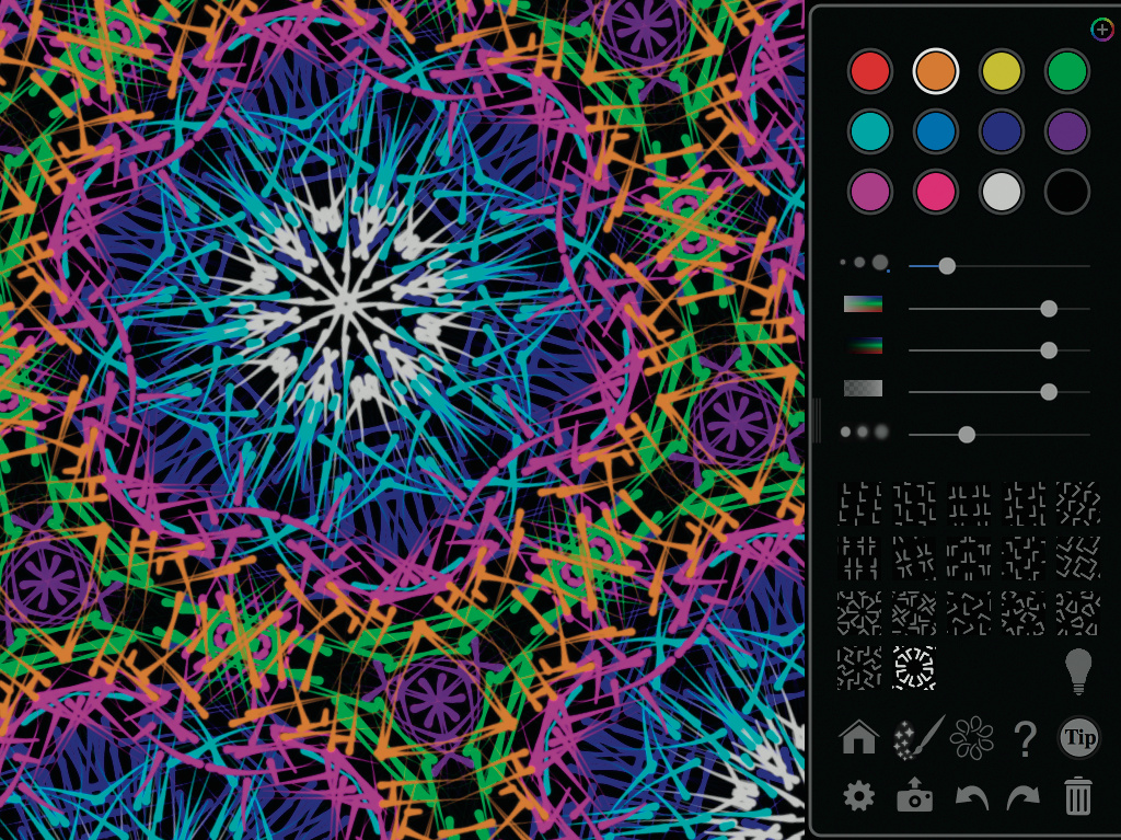 Mit iOrnament lassen sich ganz leicht bunte Muster malen, die an Kacheln oder Geschenkpapier erinnern. Jeder Strich, den der Finger auf der Malfläche zeichnet, erscheint sofort vielfach gespiegelt oder verschoben. Erklärungen und interaktive Beispiele führen in die hochkomplexe Theorie dazu ein. Sie ist aber keineswegs nötig, um beim Malen Spaß zu haben.