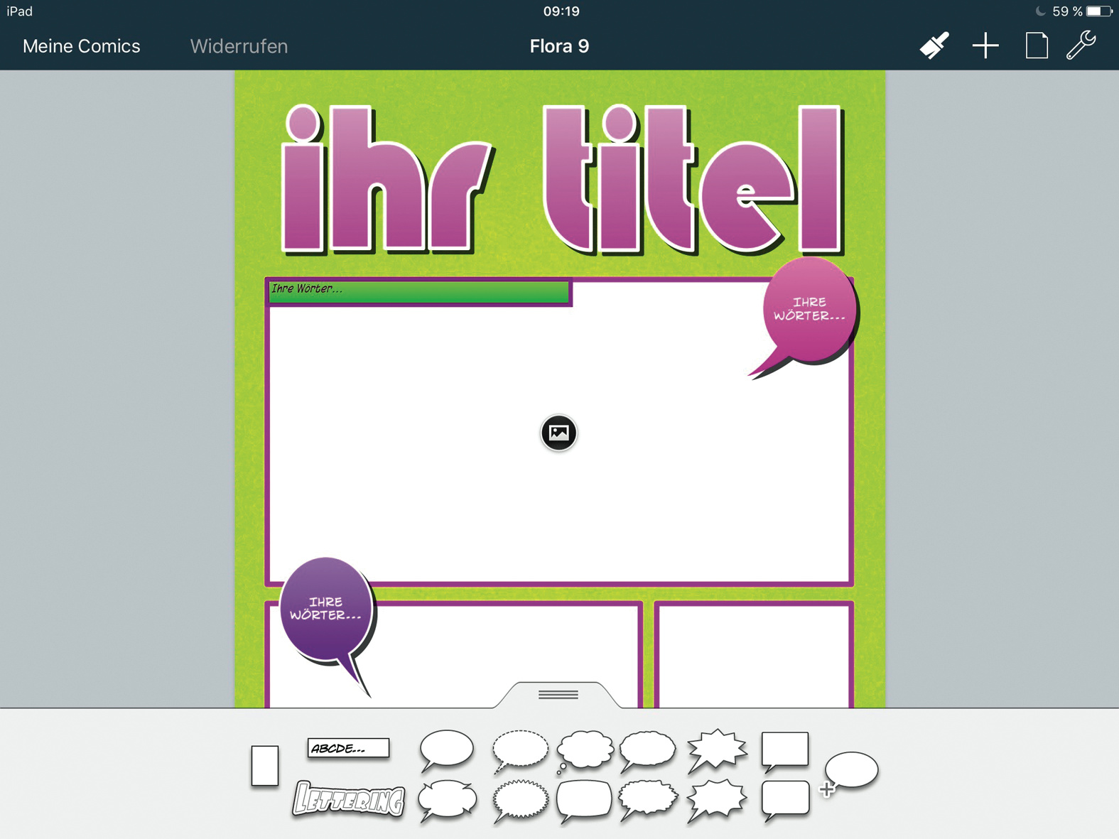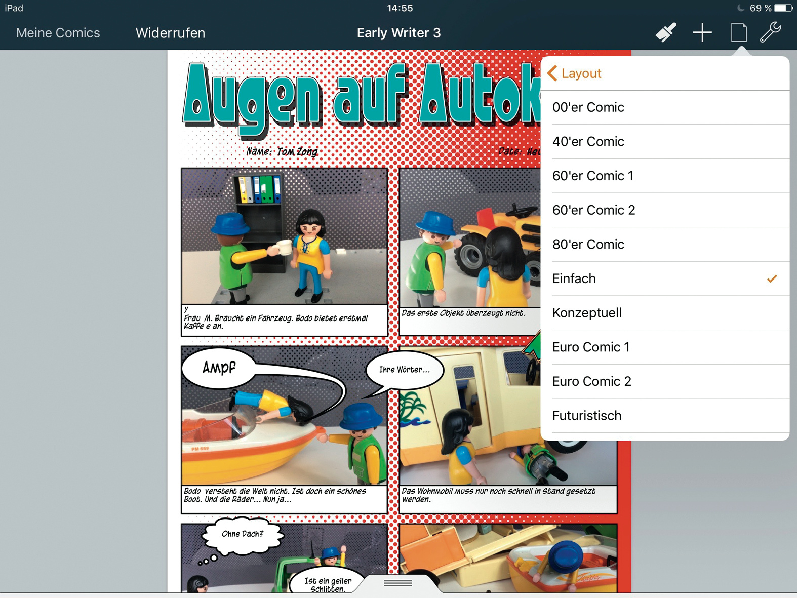 Ein neues Projekt beginnt mit einem Tipp auf das Pluszeichen und einem zweiten auf „Comic erstellen“. Wir haben uns für das Layout „Early Writer 3“ entschieden. Nach der Layout-Auswahl wechselt die App in den Bearbeitungsmodus und präsentiert Blindtext und leere Fenster. Übrigens: Über das Blatt-Papier-Symbol im oberen Menü werden Ihnen zu jedem Layout ein paar Variationen im ähnlichen Stil angeboten.