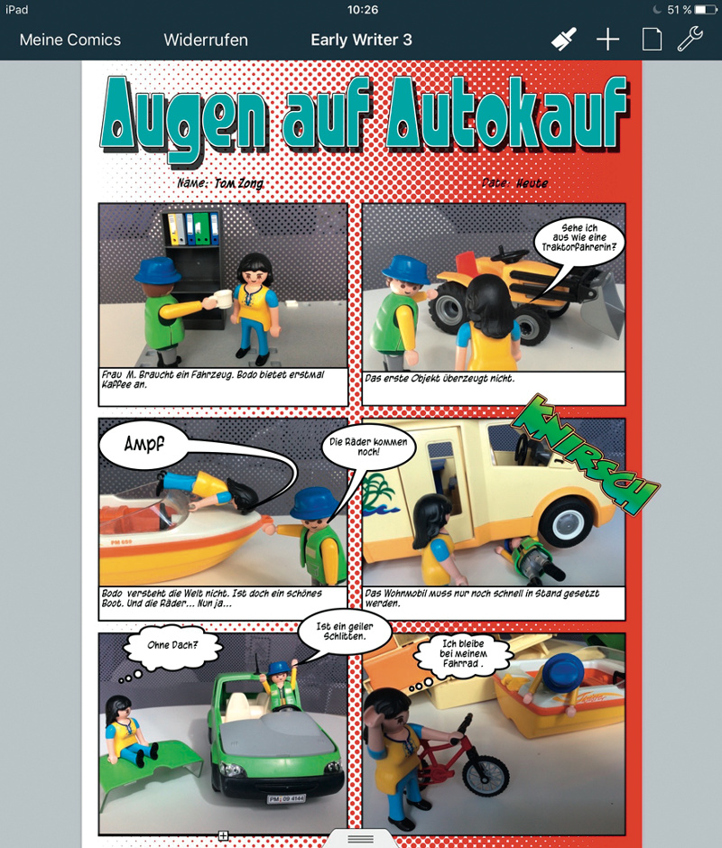 Dank der fast selbsterklärenden Bedienung von Comic Life gelangt man in wenigen Schritten vom Konzept bis zum fertigen Comic. Wir haben das mit einem einseitigen Foto-Comic durchgespielt, in dem Playmobil-Figuren auftreten. Der Inhalt soll so aussehen: Eine Frau möchte ein Auto kaufen, gerät aber an einen windigen Verkäufer und bleibt schließlich lieber bei ihrem Fahrrad. Die Fotos dafür haben wir vorab erstellt.