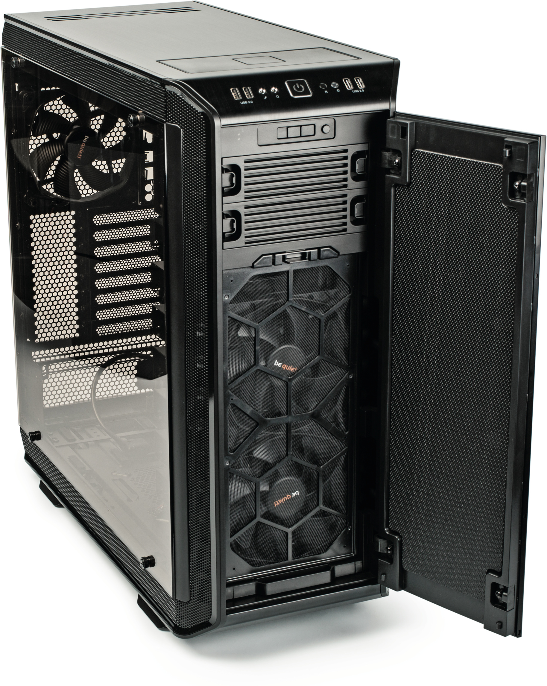 Der knapp 60 cm hohe Big-Tower von Be quiet! bietet viel Platz für leistungsfähige PC-Komponenten: Er nimmt E-ATX-Mainboards, sieben 3,5"-Festplatten sowie vier Radiatoren von Wasserkühlungen auf. Die Festplatten sitzen jeweils einzeln in ausbaubaren Käfigen, der Mainboard-Träger lässt sich in drei verschiedenen Höhen sowie um 180 Grad gedreht montieren und der Einbauplatz des Netzteils am Boden ist verschiebbar. Die größere Flexibilität macht den Zusammenbau des Rechners aber auch etwas aufwendiger.
