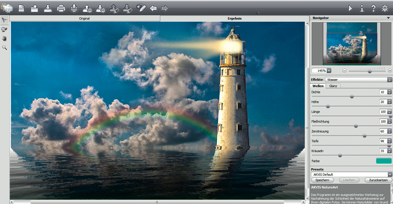 Das Programm Nature effects 8 aus dem Franzis-Verlag hilft beim Erstellen von Fotomontagen mit Bildmaterial von Wetterphänomenen. Es bringt laut Hersteller über 100 Effekteinstellungen in den Kategorien Regenbogen, Blitze, Regen, Eis, Sonne, Nordlichter, Wolken, Feuer, Reif, Nebel und Wasser. So sollen sich etwa Flammenspuren im Bild auftragen lassen. Über Regler steuert man zum Beispiel den Einfallswinkel des Regens und bestimmt über Auswahlwerkzeuge die Bildregion für den Natureffekt. Das Programm läuft selbstständig oder als Photoshop-Plug-in und kostet 120 Euro. (akr@ct.de)