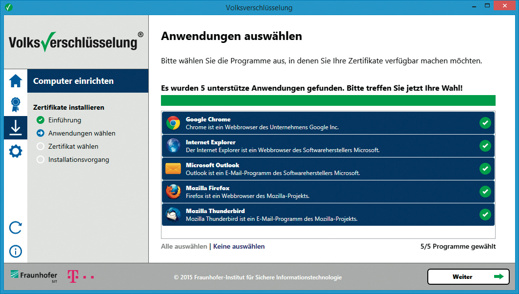 Mit der jüngst gestarteten Volksverschlüsselung will das Fraunhofer-Institut für Sichere Informationstechnologie (Fraunhofer SIT) den Ende zu Ende verschlüsselten Versand von E-Mails kostenlos mit wenigen Klicks für jedermann handhabbar machen. Als Partner holten sie sich Ende 2015 die Deutsche Telekom mit ins Boot, die die Infrastruktur stellt.