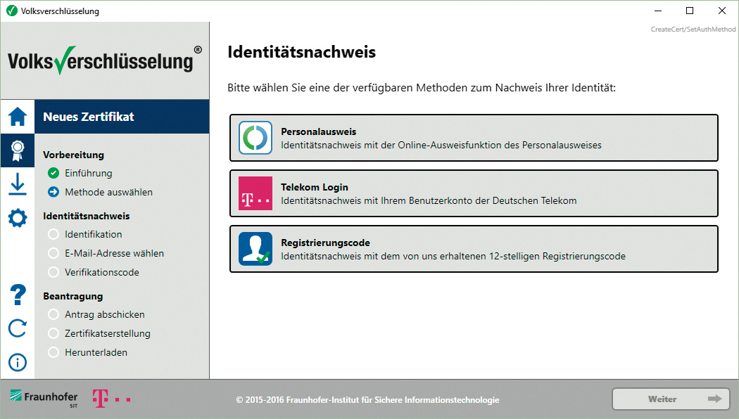 Für einen Schlüssel muss der Anwender seine Identität nachweisen. Aktuell ist dies über die eID-Funktion des elektronischen Personalausweises in Verbindung mit einem Chipkarten-Lesegerät möglich. Telekom-Kunden können die Registrierung mit ihren Log-in-Daten über die Volksverschlüsselungs-Anwendung anstoßen. Alternativ kann man sich auf einer Veranstaltung direkt am Fraunhofer-SIT-Stand für den Service anmelden.