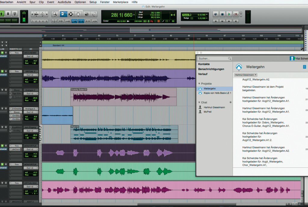 Für das Zusammenspiel kopiert man zunächst eine lokal gespeicherte Pro-Tools-Session als „Project“ in die Cloud. Dabei werden nahezu alle Parameter übernommen; lediglich Mix- und Edit-Gruppen, Clip-Gruppen sowie VCA- und Video-Spuren landen nicht in der Wolke. Anschließend kann der Uploader bis zu zwei weitere Künstler zur Mitarbeit einladen. Das geschieht per Textnachricht in einem Chat-Fenster. Für die Einladung muss er die Namen oder Mail-Adressen aus den Pro-Tools-Profilen der anderen Musiker kennen.